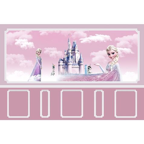 | Patterns/Elements | Central fairy – tale castle (light blue with purple accents), two prominent characters in purple/pink dresses, smaller figures like snowmen, white fluffy clouds |