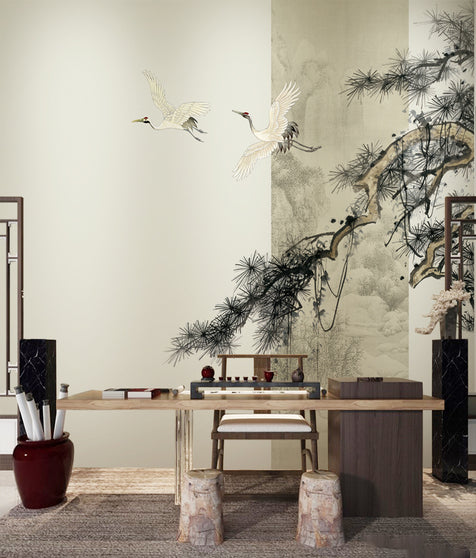 - Colors: Light beige/off – white base color, varying greens for leaves/branches, white, yellow, and greenish hues for birds, dark green/black for pine branches, white with red accents for cranes