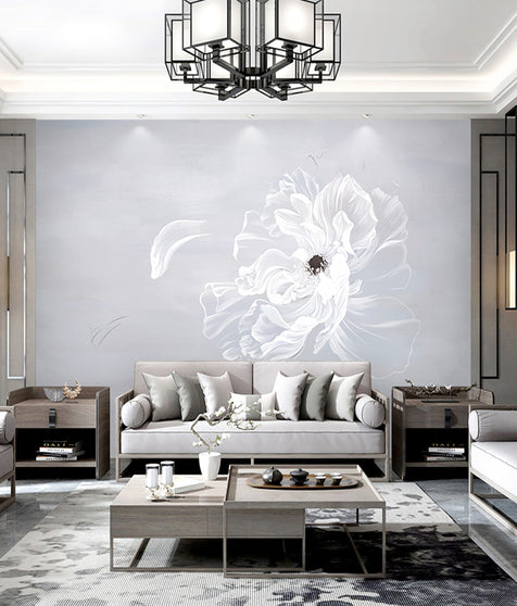 - Design Style: A large, stylized flower with translucent, overlapping petals and a dark central core on a soft gray background