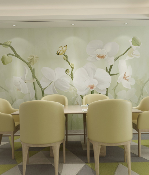 This wall mural is a great way to turn a plain wall into a beautiful focal point. It features a detailed botanical floral design with large white orchids, green stems, and a yellow butterfly on a light sage – green background. Suitable for both residential and commercial interior spaces.