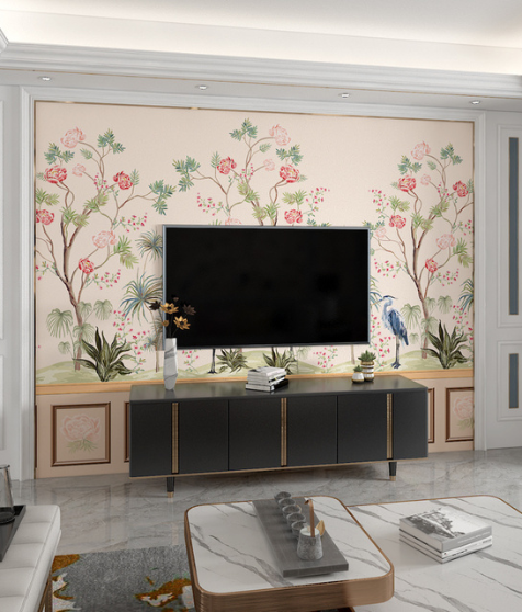 | Colors | Dominated by soft, muted tones: a light peach/beige base, with vibrant accents of green (foliage), pink/red (flowers), blue (birds), and teal (bedding/furniture in styled images). Subtle earthy browns (tree trunks) and cream (framed paneling) add depth. |