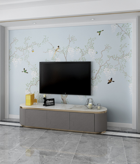 - Colors: Soft, muted tones including light sky blue background, pale gray or beige branches, white flowers, light green leaves, and birds in varied hues