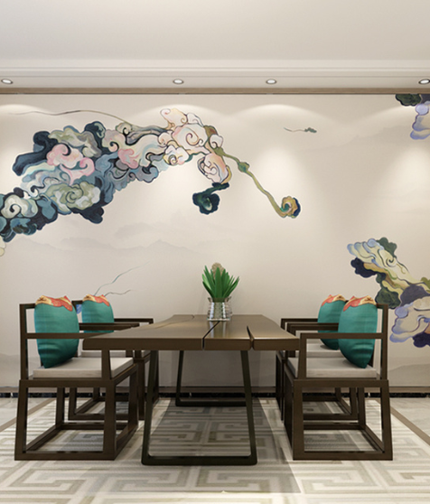 | Patterns/Visual Elements | Abstract, flowing cloud motifs resembling traditional East Asian “ruyun” clouds with intricate, curvy lines and layered, organic shapes. Faint, blurred mountain or wave outlines in the background and scattered smaller cloud – like elements and delicate tendrils |