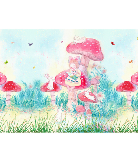 - Key Elements: Large pink mushrooms, white rabbits, colorful butterflies, and background elements like sky, grass, and flowers