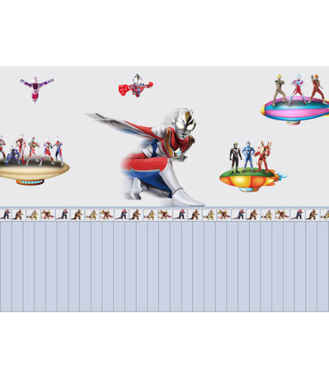 - Design Elements: Large central Ultraman figure, smaller Ultraman characters on floating platforms, border strip of tiny Ultraman figures, additional flying figures