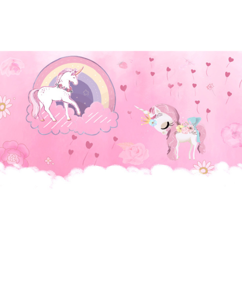 - Design Theme: Whimsical unicorn-themed with magical, pastel – pink decor, featuring unicorns, rainbows, hearts, and floral elements