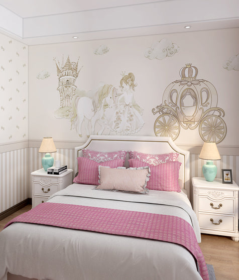 | Color & Design | Primary Colors: Soft pastel tones (off – white/cream background, light gold/beige for illustration). Design Elements: A detailed fairy – tale scene with a princess, horse, carriage, castle, and clouds in a hand – drawn style. Complementary Colors: Harmonizes with pink bedding and white furniture. |