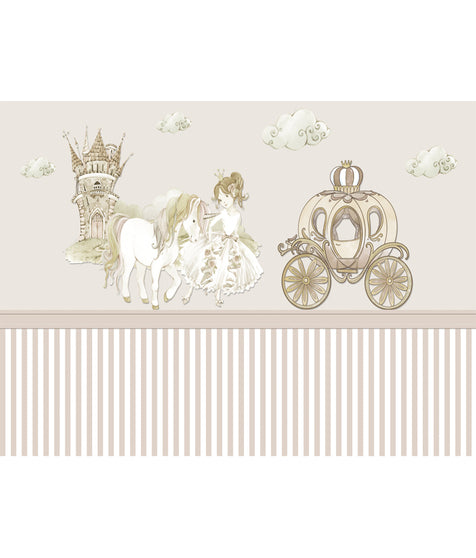 - Design Style: Whimsical fairy – tale illustration with a princess, unicorn, castle, pumpkin carriage, and fluffy cloud shapes
