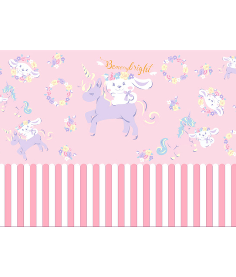 - Design Features: Repeating motifs of a bunny riding a unicorn, floral wreaths, and decorative text; vertical striped paneling at the lower wall; whimsical elements create a fairy – tale vibe