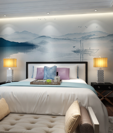 - Design Style: Traditional East Asian ink – wash art style with layered mountains, water reflections, a boat silhouette, and small birds