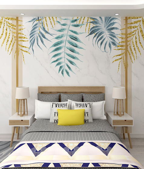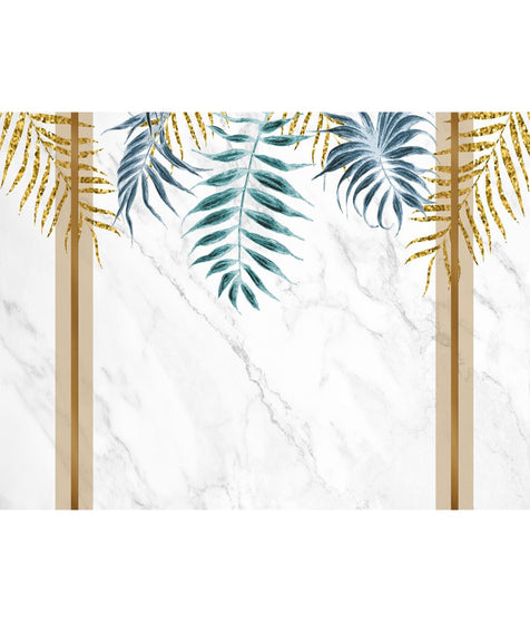 - Color Scheme: Dominant white marble background with gray veining, blue tropical leaves in various shades, and shiny gold accents
