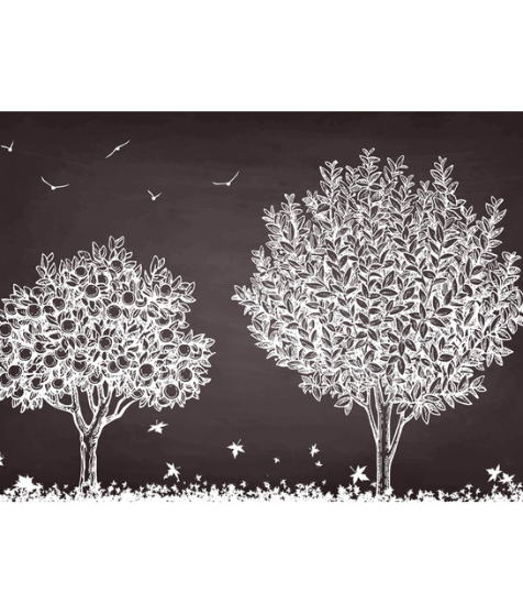 - Design Features: Symmetrical composition of two large trees with distinct patterns, flying birds, and a bottom foliage border