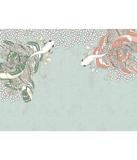 | Patterns/Elements | Two stylized white koi fish with foliage details, intricate linework on fins/tails, small white floral motifs |