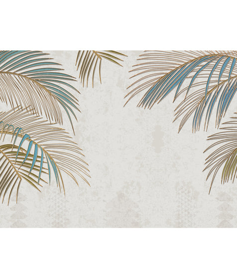| Colors | Dominant hues include a soft, off – white/cream background, teal/aquamarine blue leaves, and gold/bronze (or bronze – toned gold) palm fronds |