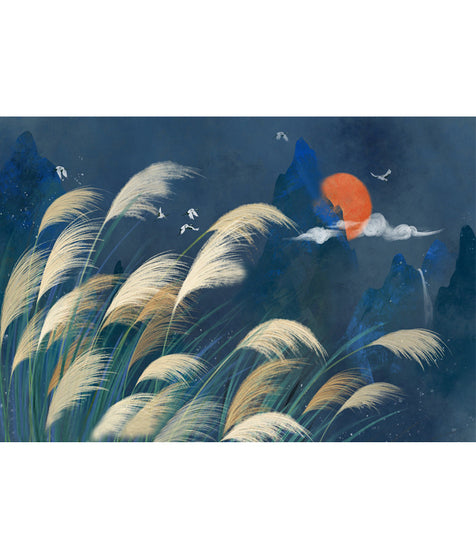 - Design Features: Foreground with tall feathery grass, mid – ground with blue mountain silhouettes, background with a bright sun, clouds, and flying birds; modern minimalist style with East Asian landscape inspiration