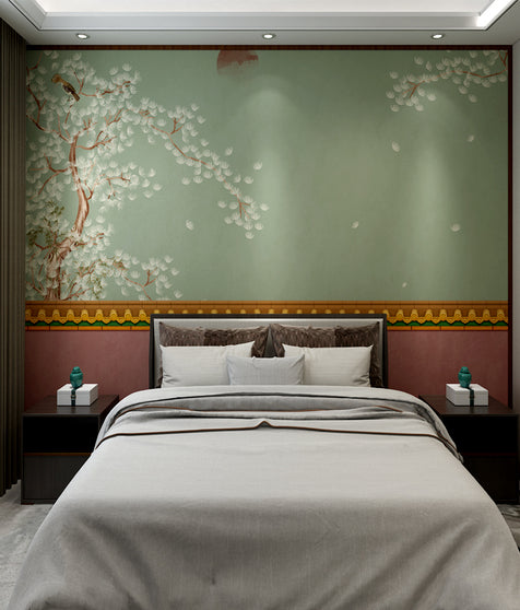 - Key Components: Flowing grass plumes, abstract blue mountains, sun, clouds, and flying birds; seamless design across the wall